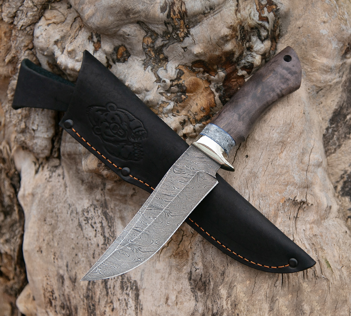 Нож Клыч из дамасской стали, рукоять - стабилизированная карельская береза + искуственный камень, кожаный чехол в комплекте.