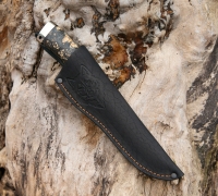 Нож Охотничий из дамасской стали, рукоять - стабилизированный кап клёна, кожаный чехол в комплекте.