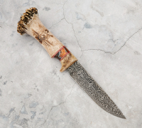Нож Сибиряк из мозаичной дамасской стали, рукоять - лосинный рог (ручное выжигание), зуб мамонта. Кожаный чехол с переплетом идет в комплекте.