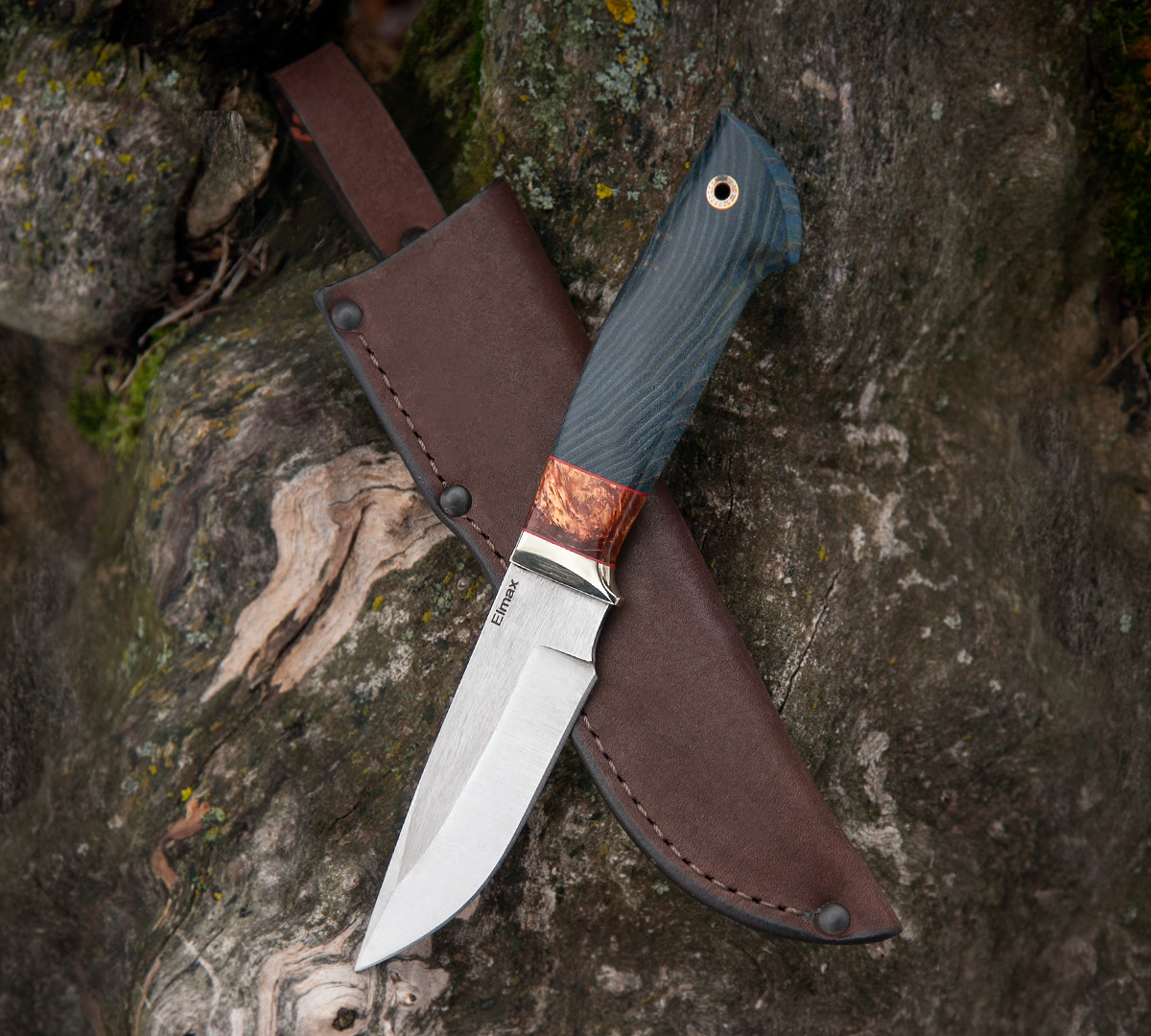 Нож Норвег из порошковой нержавеющей стали Elmax, рукоять - стабилизированный сувель, кожаный чехол идет в комплекте.